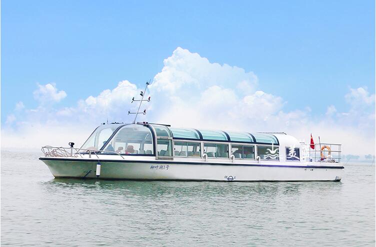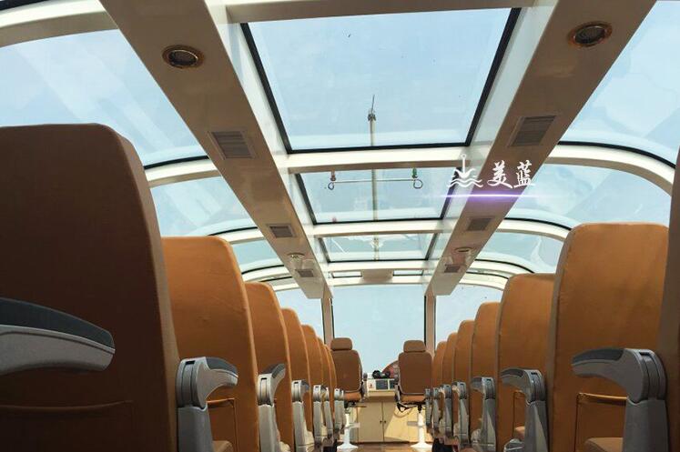 本船为全通透玻璃钢观光游艇,外型简洁明快,晶莹透剔,通体流畅,脱俗高雅,富有现代气息。舱内舒适宽敞,温度宜人,视野广阔。它既为一个水上观光游览用的高档交通工具,它为当地旅游环境增添一道流动靓丽的风景线。